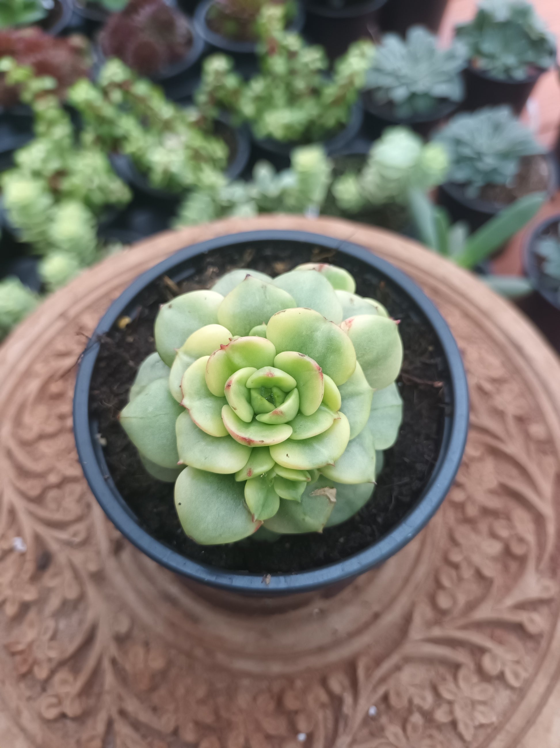 Suculenta de origen asiático. sus colores pueden cambiar según época del año y el estrés hidrico y térmico.